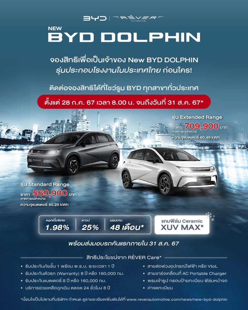 Rever Automotive ได้เปิดตัวพร้อมเผยราคาพร้อมแคมเปญไปสำหรับ BYD Dolphin ประกอบไทยอย่างเป็นทางการ ประกอบที่โรงงาน ณ นิคมอุตสาหกรรมดับบลิวเอชเอ จังหวัดระยอง บนพื้นที่ กว่า 948,000 ตารางเมตร ด้วยกำลังการผลิต สูงสุดถึง 150,000 คันต่อปี