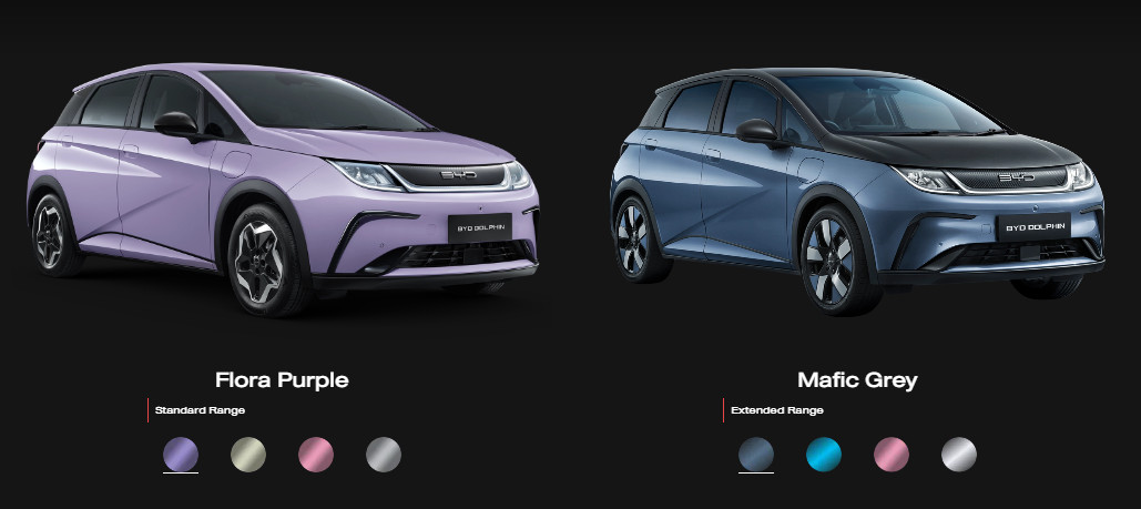 - BYD Dolphin รุ่น Extended Range มีตัวเลือกภายนอกทูโทน 4 สีได้แก่ สีใหม่ สีขาว (Frost White) สีใหม่สีเทา (Graphite Grey) สีครีม (Coastal Crème) และสีชมพู Coral Pink ตกแต่งภายในเหลือสีเดียวคือ สีดำและสีเทา (Black + Grey)