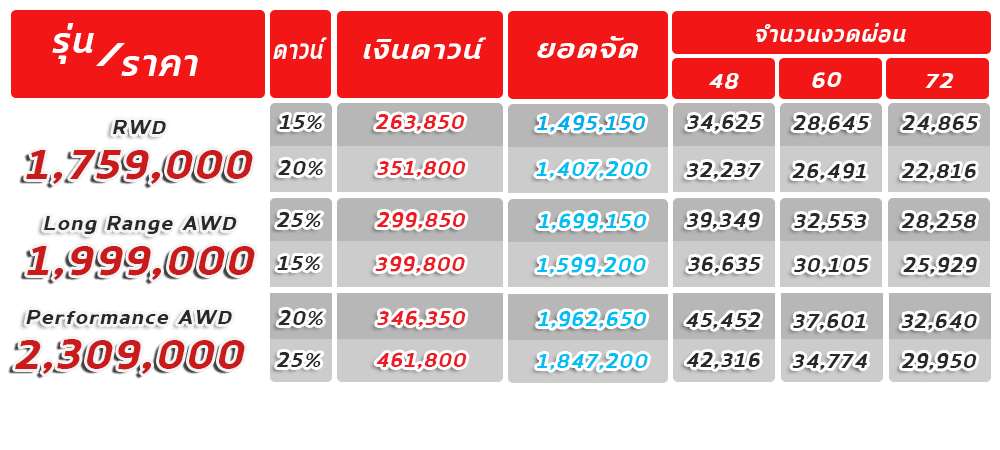 ลดอีก 250,000 บาท! ลดสูงสุดจนคนที่ซื้อไปก่อนมีเคือง สำหรับ TESLA ประเทศไทย ลดราคา รอบ 3 ส่วนลด 100,000 บาท ในรุ่น Rear-Wheel Drive ส่วนลด 120,000 บาท ในรุ่น Long Range ส่วนลด 250,000 บาท ในรุ่น Performance เงื่อนไขรับรถภายในวันที่ 31 สิงหาคม 2023 นี้ และ ฟรีประกันภัยชั้น 1 เมื่อจัดไฟแนนซ์กับสถาบันการเงินที่ร่วมรายการ : ทิสโก้, กรุงศรีฯ, เกียรตินาคิน, กสิกรไทย ราคาจำหน่ายเริ่มที่ 1,659,000 – 2,059,000 บาท